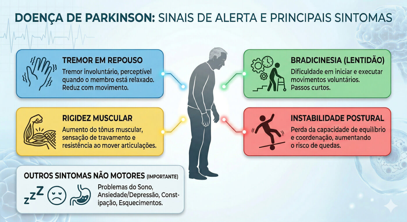 No início, a Doença de Parkinson causa frequentemente somente sintomas suaves. À medida que piora, os sintomas podem afetar a capacidade de uma pessoa para trabalhar ou fazer atividades diárias e, quando se torna ainda mais grave, as pessoas com a doença às vezes precisam de ajuda para os cuidados básicos.