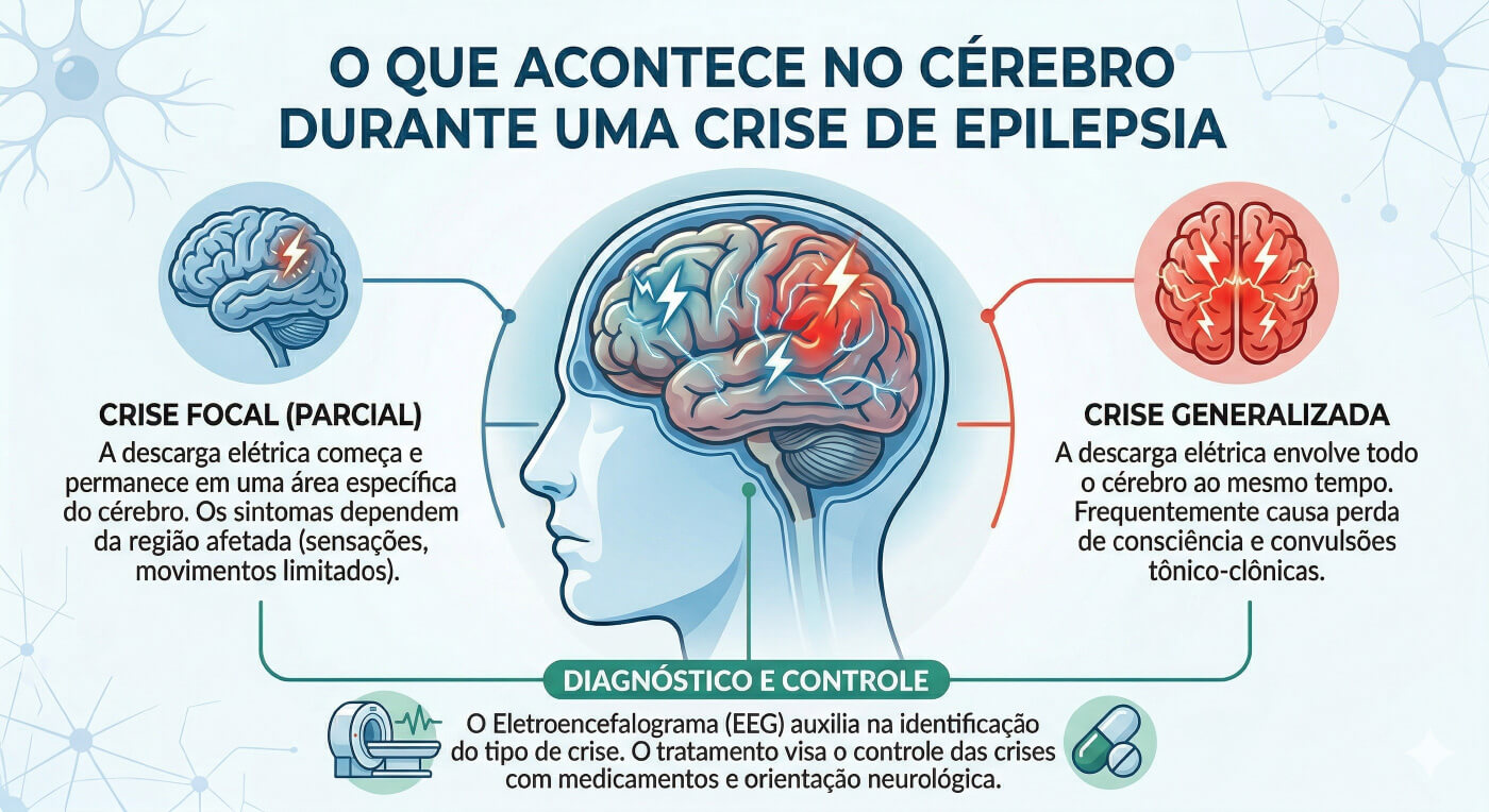 Existem diferentes tipos de convulsões. Durante alguns segundos ou minutos, uma parte do cérebro emite sinais incorretos, que podem ficar restritos a esse local ou espalhar-se. Se ficarem restritos, a crise receberá o nome de Crise Parcial (Focal); se envolverem os dois hemisférios cerebrais, receberá o nome de Crise Generalizada.